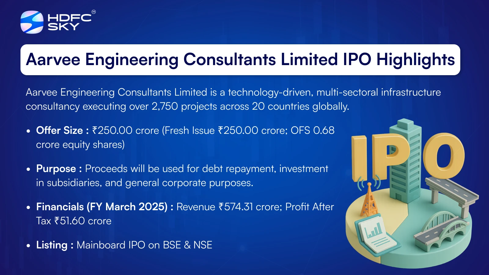 Aarvee Engineering Consultants Ltd. has submitted its Draft Red Herring Prospectus (DRHP) to SEBI on 25 September 2025, signalling its intention to raise capital through an Initial Public Offering (IPO). The proposed IPO will follow the Book Building route and comprises a fresh issue worth ₹250 crore along with an Offer for Sale (OFS) of up to 0.68 crore equity shares. The company plans to list its shares on both the NSE and BSE. While Kfin Technologies Ltd. has been appointed as the registrar of the issue, the book running lead manager is yet to be announced. Key IPO details, including the price band, dates, and lot size, are currently pending.