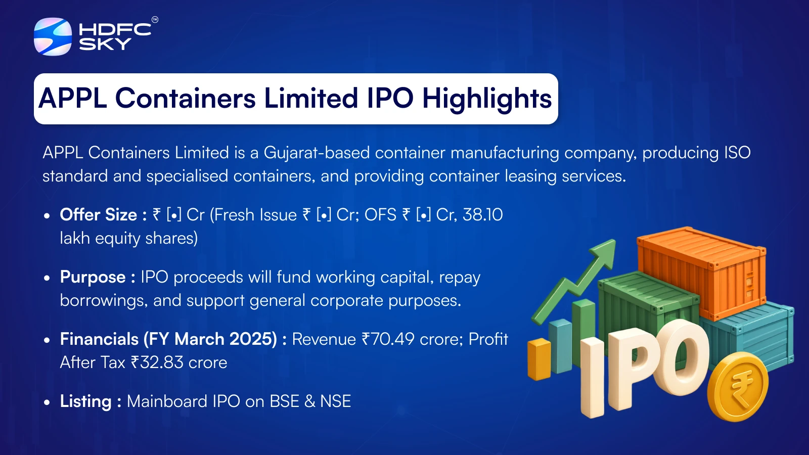 Appl Containers Ltd., based in Bhavnagar, Gujarat, operates a 59,115 sq. mt. manufacturing facility with an annual capacity of 15,000 containers. Established in 2021, the company produces ISO-standard and specialised containers, including BESS, coil, and cement tank variants. In 2026, it ventured into container leasing services and, through its subsidiary Aawadkrupa Plastomech Pvt. Ltd., began producing plastic extrusion and rope-making machinery. As of August 31, 2025, Appl Containers has manufactured 13,101 units and holds an order book of 802 containers worth ₹2,834.27 lakh, along with 170 service orders.