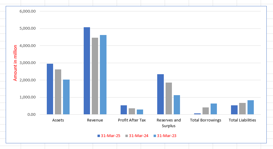 The company demonstrates a track record of consistent growth in its financial performance, supported by an expanding customer base and effective operations. Key financial indicators show significant improvement, such as a rise in Revenue from Operations from $4,629.28$ million in Fiscal 2023 to $5,079.12$ million in Fiscal 2025. Furthermore, the EBITDA Margin has improved from $10.66\%$ to $16.01\%$, and the Debt Equity Ratio has reduced from $0.53$ to a strong $0.03$, indicating robust financial health.