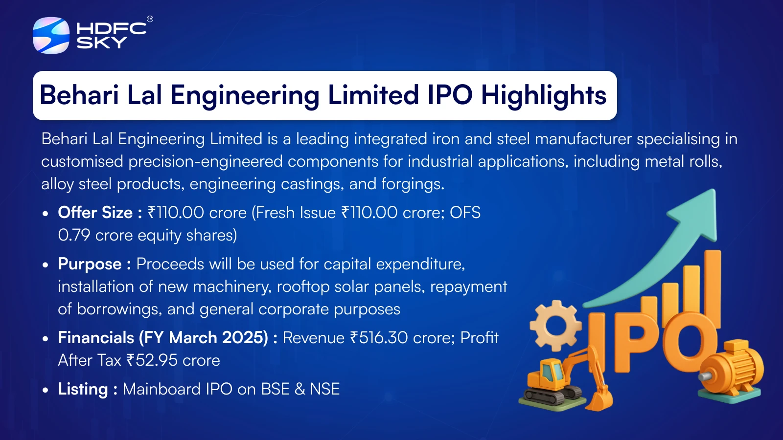 Behari Lal Engineering Ltd. filed its Draft Red Herring Prospectus (DRHP) with SEBI on September 26, 2025, to raise funds through an Initial Public Offer (IPO). The IPO will be a Book-Build Issue comprising a fresh issue of ₹110 crore and an offer for sale (OFS) of up to 78,54,521 equity shares. The equity shares are proposed to be listed on both NSE and BSE. While the book-running lead manager is yet to be announced, MUFG Intime India Pvt. Ltd. has been appointed as the registrar of the issue. Details such as IPO opening and closing dates, price band, and lot size will be disclosed later. The company’s promoters include Parkash Chand Garg, Rajesh Garg, Dinesh Garg, Lovlish Garg, and Bhuvnesh Garg, who collectively held an 88.51% stake before the issue. The IPO involves a face value of ₹10 per share and a combined sale type of fresh capital and offer for sale. Before the IPO, the total shareholding stood at 3,90,39,325 shares. For comprehensive information, investors can refer to the Behari Lal Engineering IPO DRHP.