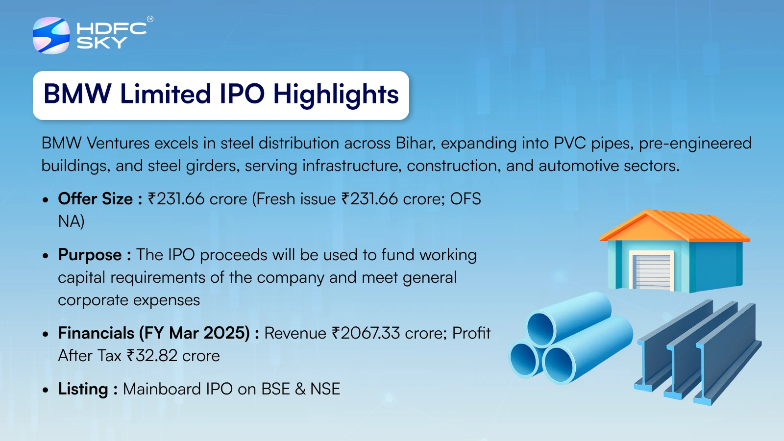BMW Ventures IPO is a book-built issue worth ₹231.66 crores, comprising a fresh issue of 2.34 crore shares. The IPO will open for subscription on September 24, 2025, and close on September 26, 2025. The basis of allotment is expected to be finalized on September 29, 2025, with the company’s shares scheduled to list on both BSE and NSE on October 1, 2025. The price band for the IPO has been set between ₹94 and ₹99 per share. Investors can apply with a minimum lot size of 151 shares, requiring an investment of ₹14,949 at the upper price band. For non-institutional investors, the lot size investment stands at 14 lots (2,114 shares) amounting to ₹2,09,286 for sNII, and 67 lots (10,117 shares) amounting to ₹10,01,583 for bNII. The book running lead manager of the issue is Sarthi Capital Advisors Pvt. Ltd., while Cameo Corporate Services Ltd. is serving as the registrar. According to the DRHP filed with SEBI, the net proceeds from the IPO will primarily be allocated toward funding the company’s working capital needs (approximately Rs 17,500 lakh) and general corporate purposes.