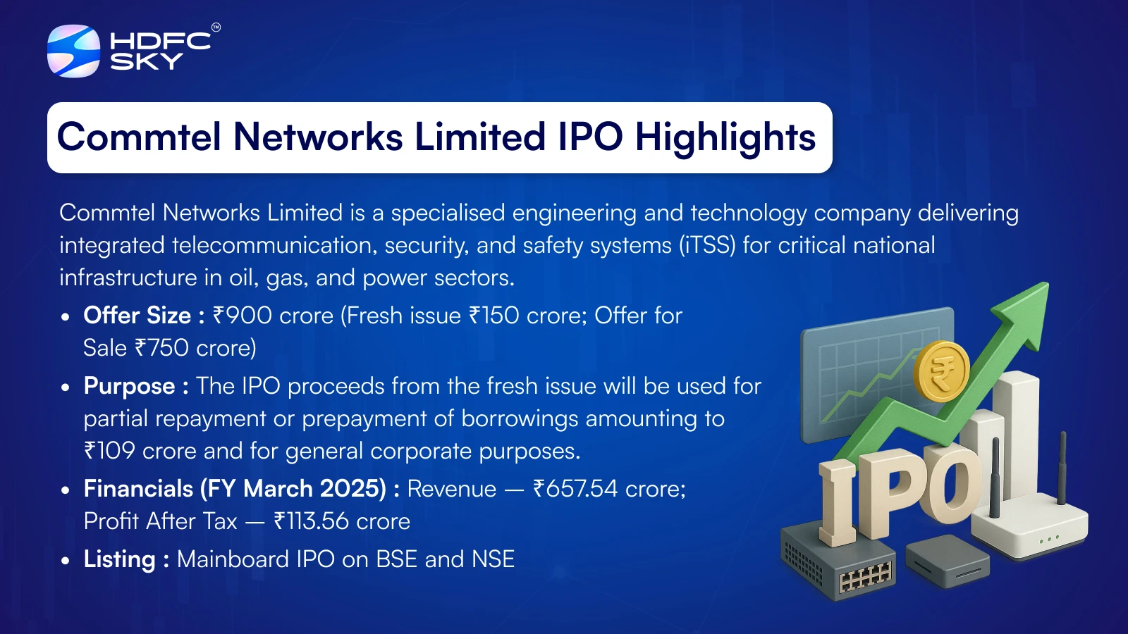 Commtel Networks Ltd. filed its Draft Red Herring Prospectus (DRHP) with SEBI on September 29, 2025, intending to raise capital through an Initial Public Offer (IPO). The proposed IPO will be a book-built issue with a total size of ₹900 crore, which includes a fresh issue of shares worth ₹150 crore and an offer for sale (OFS) of ₹750 crore. The company plans to list its equity shares on both the NSE and BSE. Equirus Capital Pvt. Ltd. has been appointed as the book-running lead manager, while MUFG Intime India Pvt. Ltd. will serve as the registrar of the issue. Details such as the IPO opening and closing dates, price band, and lot size are yet to be announced. Investors can refer to the Commtel Networks IPO DRHP for further information.