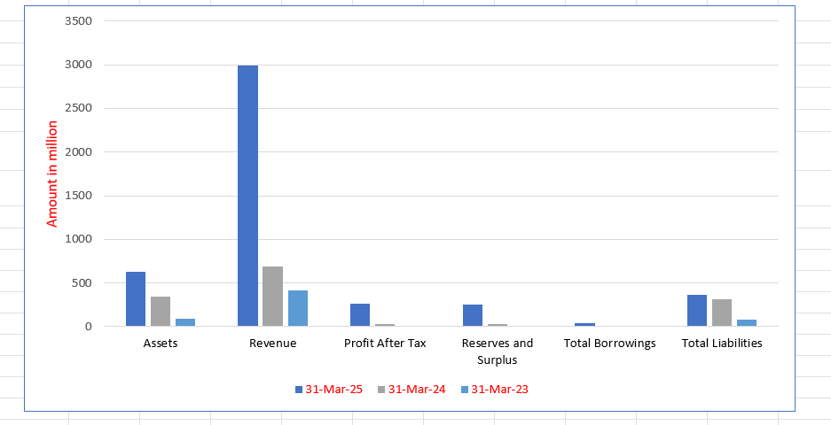For FY 2025, Deon Energy reported ₹ 2,988.02 million in revenue from operations — up from ₹ 684.26 million in FY 2024 and ₹ 418.36 million in FY 2023 — reflecting a CAGR of 167.25 %. The company’s order book stood at ₹ 5,051.55 million as of August 2025, supported by a robust clientele that includes Omax Cotspin, Fiotex Cotspin, and Megacity Vitrified LLP.