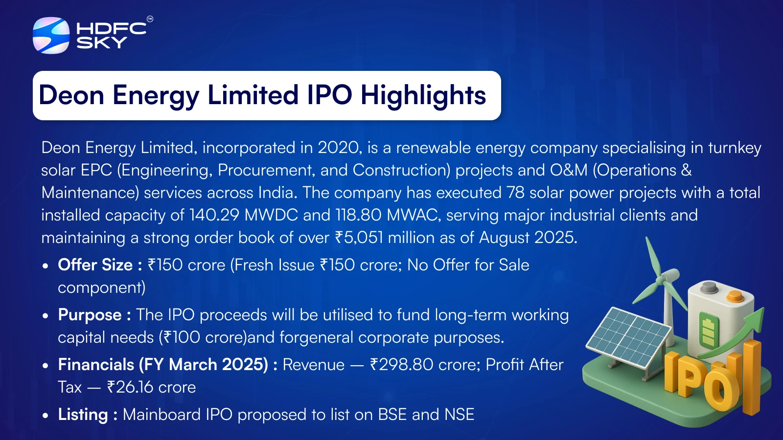 Founded in 2020, Deon Energy Limited provides comprehensive renewable energy solutions, specialising in engineering, procurement, and construction (EPC) of solar energy projects on a turnkey basis. The company caters mainly to commercial and industrial clients across India, offering EPC execution and operations and maintenance (O&M) services such as panel cleaning and inverter upkeep. It has completed 78 solar projects with a combined installed capacity of 140.29 MWDC and 118.80 MWAC. As of August 31, 2025, it held an order book worth ₹5,051.55 million and employed 137 personnel.