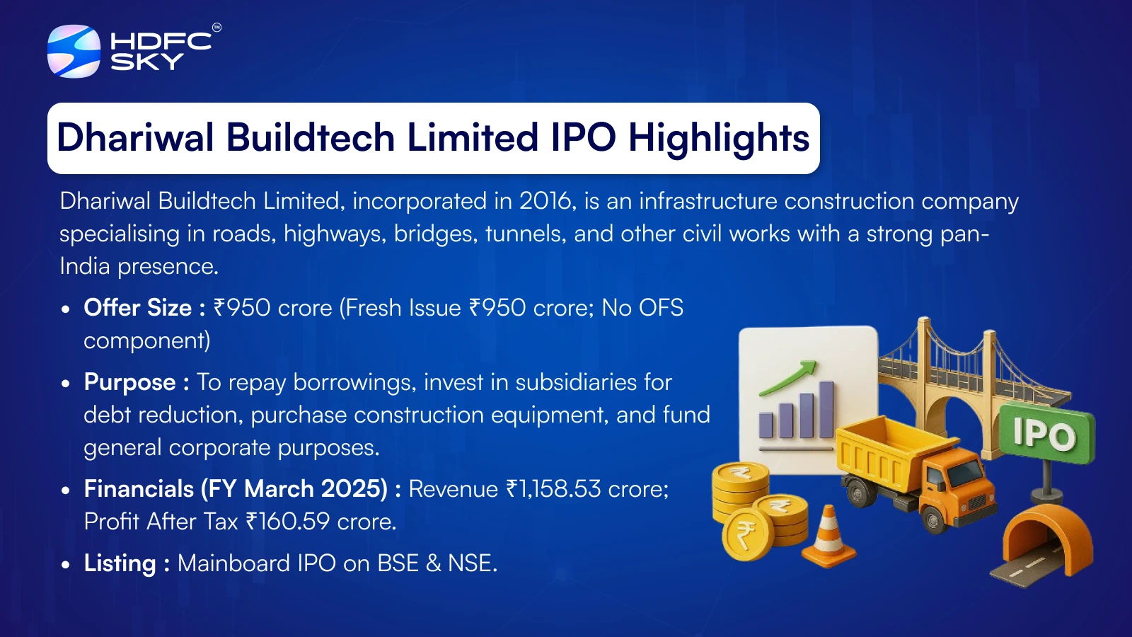 Dhariwal Buildtech Limited has submitted its Draft Red Herring Prospectus (DRHP) to the Securities and Exchange Board of India (SEBI) on September 27, 2025, to raise funds through an Initial Public Offering (IPO). The proposed IPO is a Book Built Issue amounting to ₹950 crore, entirely comprising a fresh issue of equity shares with no offer-for-sale component. The company’s shares are planned to be listed on both the National Stock Exchange (NSE) and the Bombay Stock Exchange (BSE).