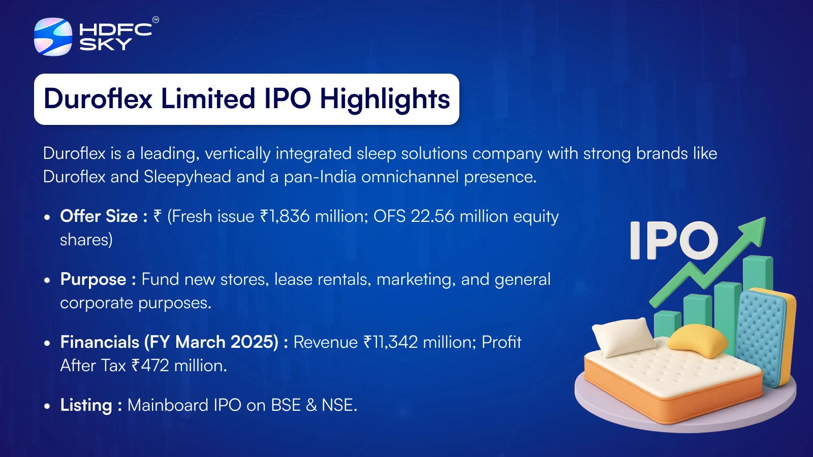 Duroflex Ltd. filed its Draft Red Herring Prospectus (DRHP) with SEBI on October 15, 2025, to raise funds through an Initial Public Offer (IPO). The IPO is structured as a Book Building Issue, comprising a fresh issue of ₹183.60 crores and an Offer for Sale (OFS) of up to 2.26 crore equity shares. The equity shares are proposed to be listed on both the NSE and BSE. While the book running lead manager has not yet been declared, KFin Technologies Ltd. has been appointed as the registrar of the issue. Key details such as the IPO dates, price bands, and lot size are yet to be announced. For more information, refer to the Duroflex IPO DRHP.