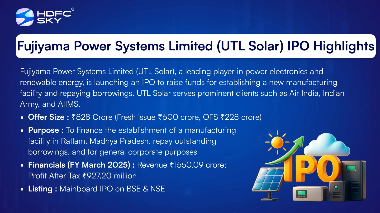 Fujiyama Power Systems IPO is a book-built issue worth ₹828.00 crore. It comprises a fresh issue of 2.63 crore shares totaling ₹600.00 crore and an offer-for-sale of 1.00 crore shares aggregating ₹228.00 crore.The IPO opens for subscription on 13 November 2025 and closes on 17 November 2025. The allotment is expected to be finalised on 18 November 2025, with a tentative listing date on 20 November 2025 on both BSE and NSE.