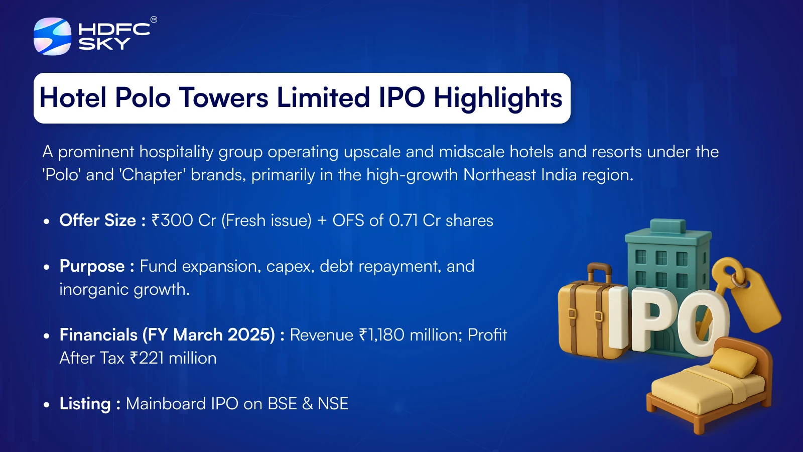 Hotel Polo Towers Ltd. filed its Draft Red Herring Prospectus (DRHP) with the Securities and Exchange Board of India (SEBI) on September 27, 2025, seeking approval to raise funds through an Initial Public Offer (IPO). The IPO is proposed as a Book Built Issue, comprising a fresh issue of ₹300.00 crores and an offer for sale (OFS) of up to 0.71 crore equity shares.