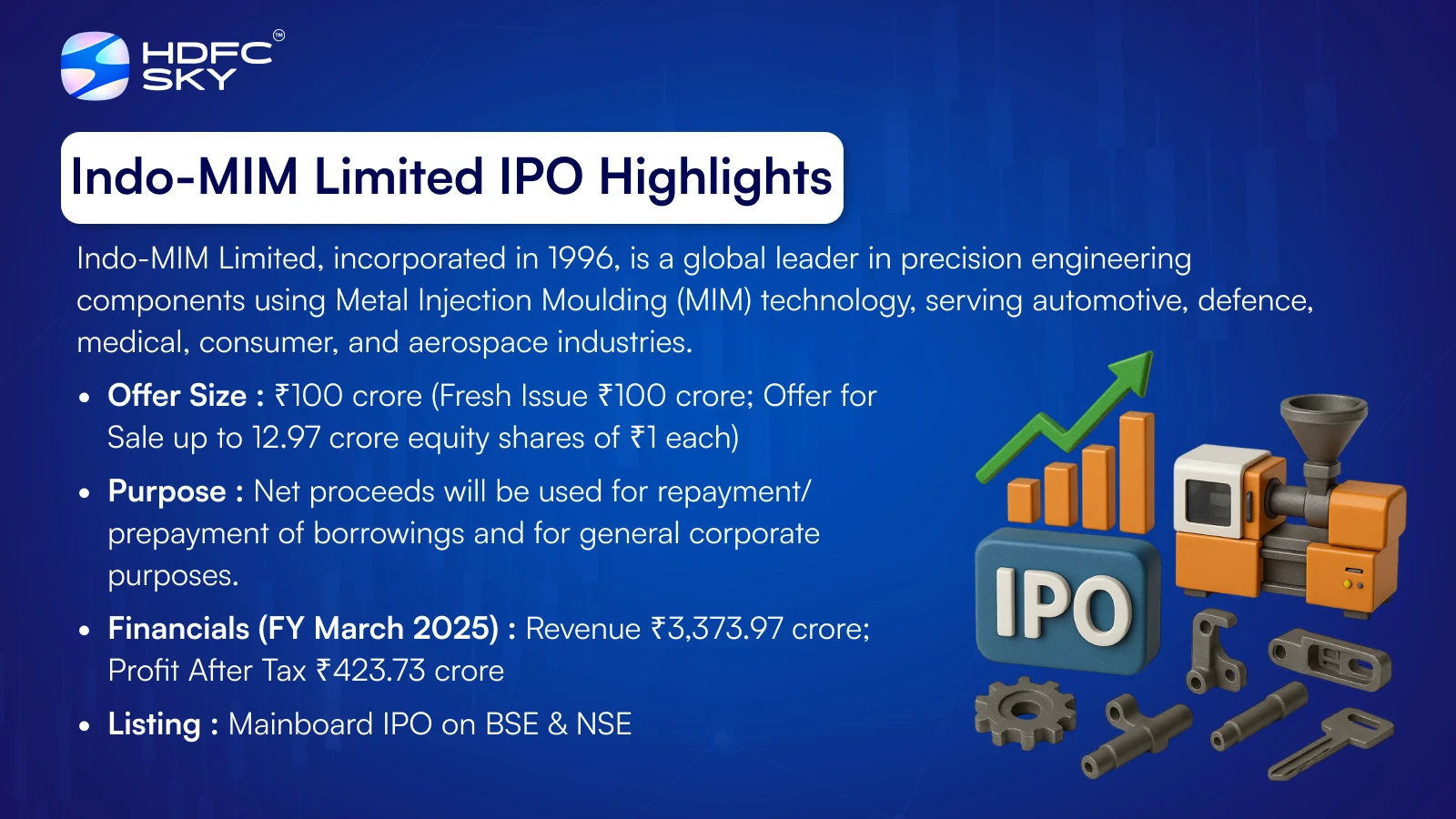 Indo-MIM Ltd. has submitted its Draft Red Herring Prospectus (DRHP) to SEBI on September 26, 2025, to raise funds through an Initial Public Offering (IPO). The proposed Indo-MIM IPO will follow the book-building route and comprises a fresh issue worth ₹100.00 crore along with an offer for sale (OFS) of up to 12.97 crore equity shares. The company’s equity shares are planned to be listed on both the NSE and BSE. HDFC Bank Ltd. will serve as the book-running lead manager, while MUFG Intime India Pvt. Ltd. will act as the registrar for the issue. Key information such as the IPO opening and closing dates, price band, and lot size are yet to be announced. Investors are advised to refer to the Indo-MIM IPO DRHP for comprehensive details.