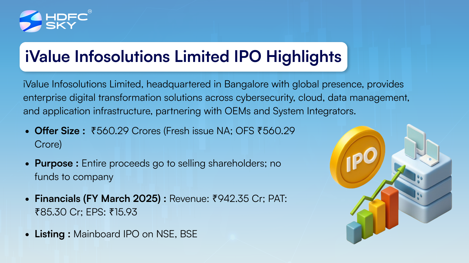 Founded in 2008, iValue Infosolutions Limited is a technology services and solutions provider focused on enterprise digital transformation. Headquartered in Bangalore, with eight offices across India and international presence in Singapore, Bangladesh, Sri Lanka, UAE, Cambodia, and Kenya, it caters to diverse markets. The company delivers customised solutions for securing and managing digital applications and data, working closely with System Integrators and OEMs. Its business spans cybersecurity, information lifecycle management, data centre and application lifecycle infrastructure, cloud services, and other OEM-supported, customer-specific solutions.