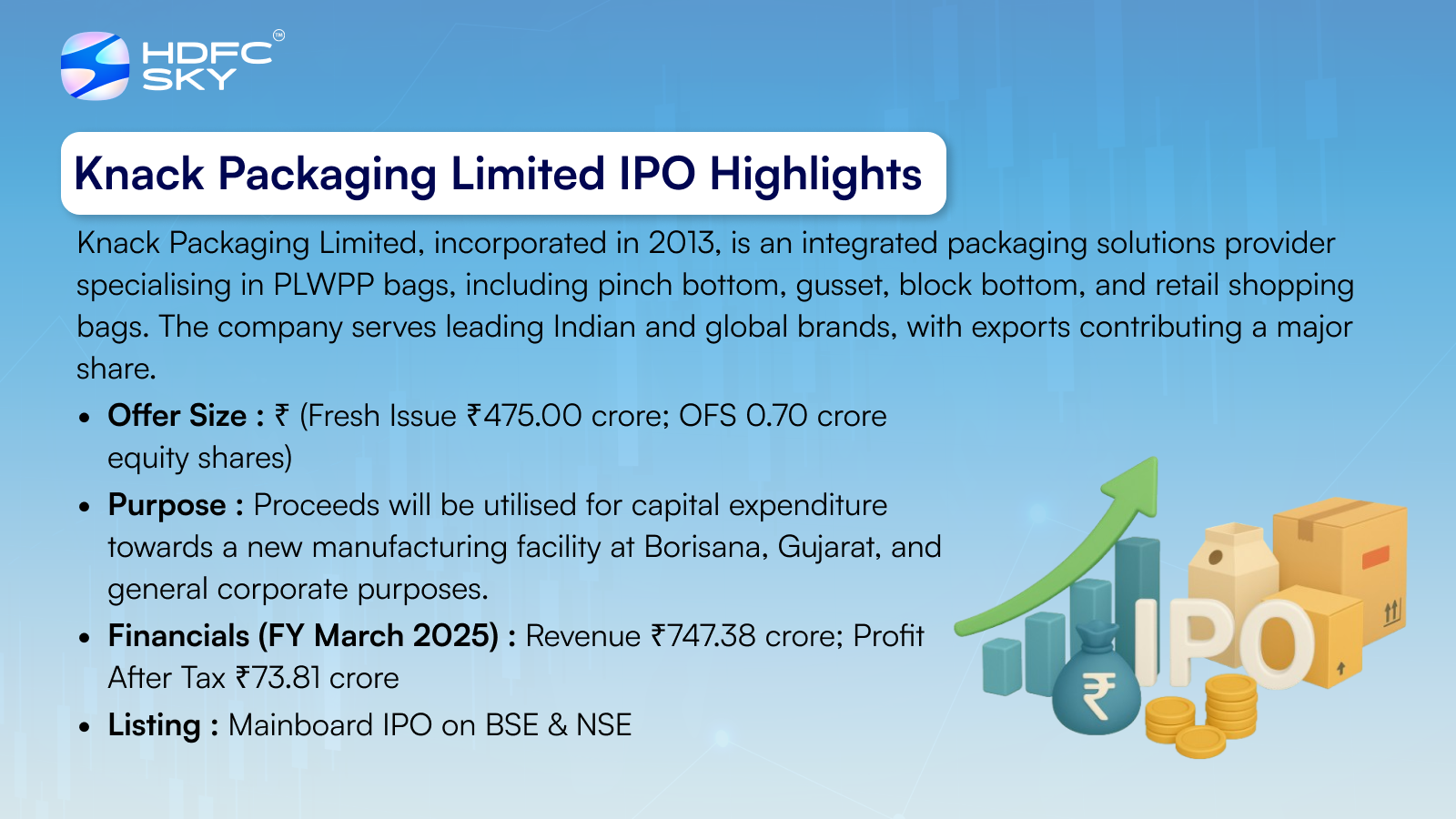 Knack Packaging Ltd. filed its Draft Red Herring Prospectus (DRHP) with SEBI on September 4, 2025, seeking to raise funds through an Initial Public Offer (IPO). The IPO is structured as a Book Build Issue, comprising a fresh issue of ₹475.00 crore and an offer for sale (OFS) of up to 0.70 crore equity shares. The company’s equity shares are proposed to be listed on NSE and BSE. While the book running lead manager is yet to be declared, MUFG Intime India Pvt. Ltd. will act as the registrar. Key details such as IPO dates, price bands, and lot size are yet to be announced. The company has a pre-issue shareholding of 10,00,00,000 shares, with promoters Alpesh Tulsibhai Patel, Pravinkumar Ambalal Patel, and Rashminbhai Tulsibhai Patel holding 89.6%. Post-issue promoter holding will depend on the equity dilution resulting from the IPO.