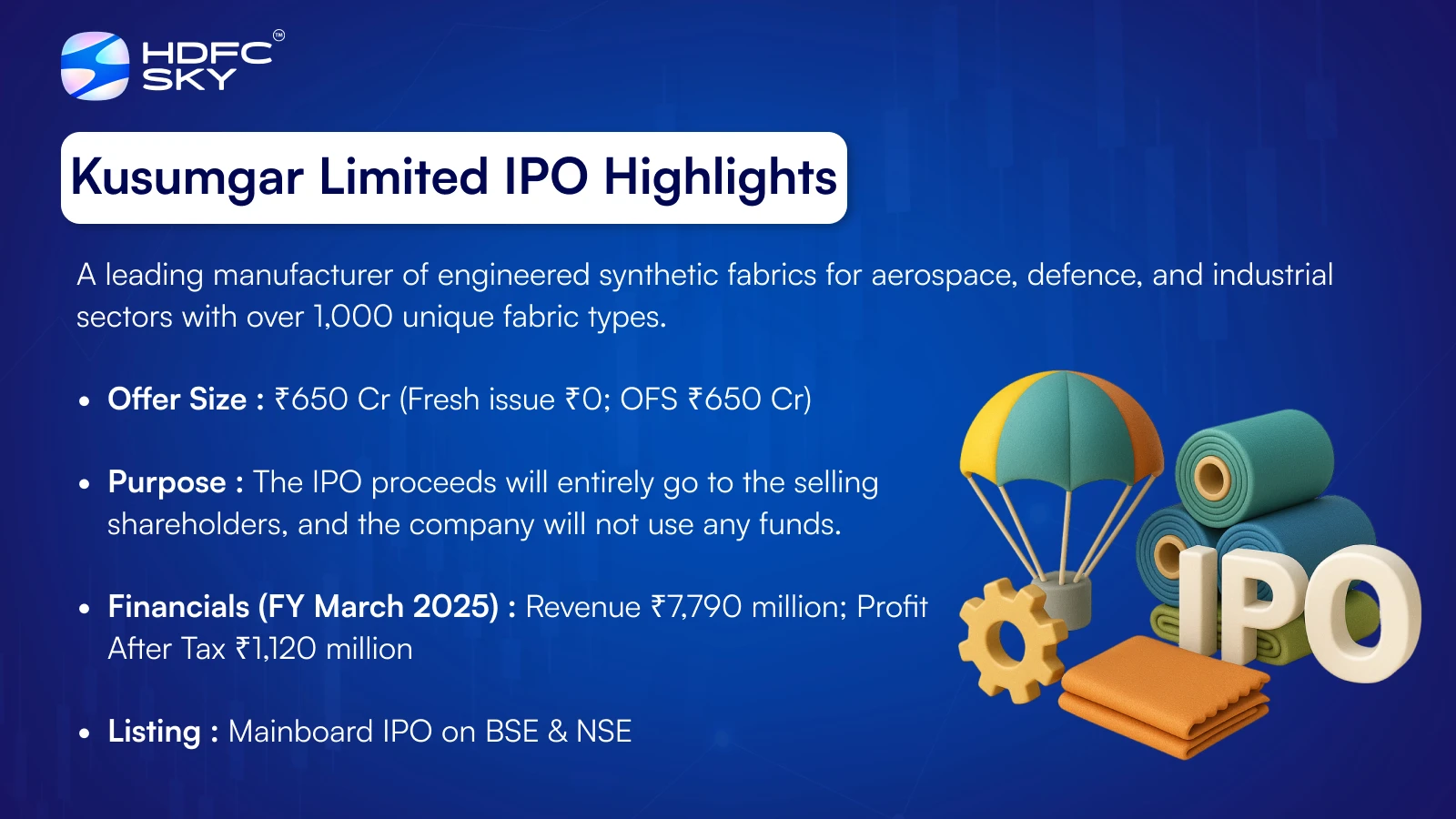 The Kusumgar Limited IPO is entirely an Offer for Sale (OFS) of ₹650 crores by the promoter selling shareholders.
