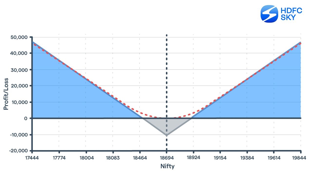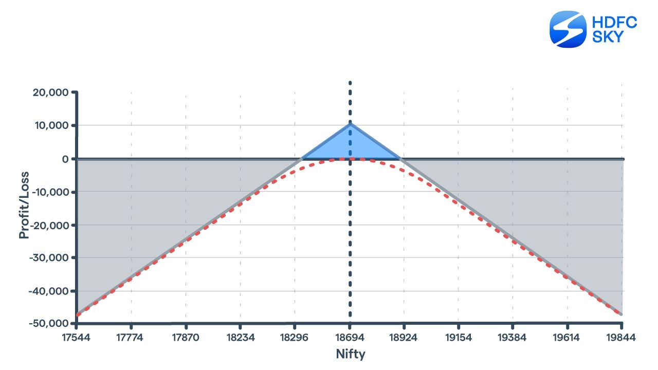 In rare cases, the underlying index moves in one direction quickly, which leads to the stop loss getting triggered on the other side. Then the underlying moves in the opposite direction equally fast and the option in the profit also gives losses. Smart traders hence do not hold the straddle for long. They prefer to book profits quickly.