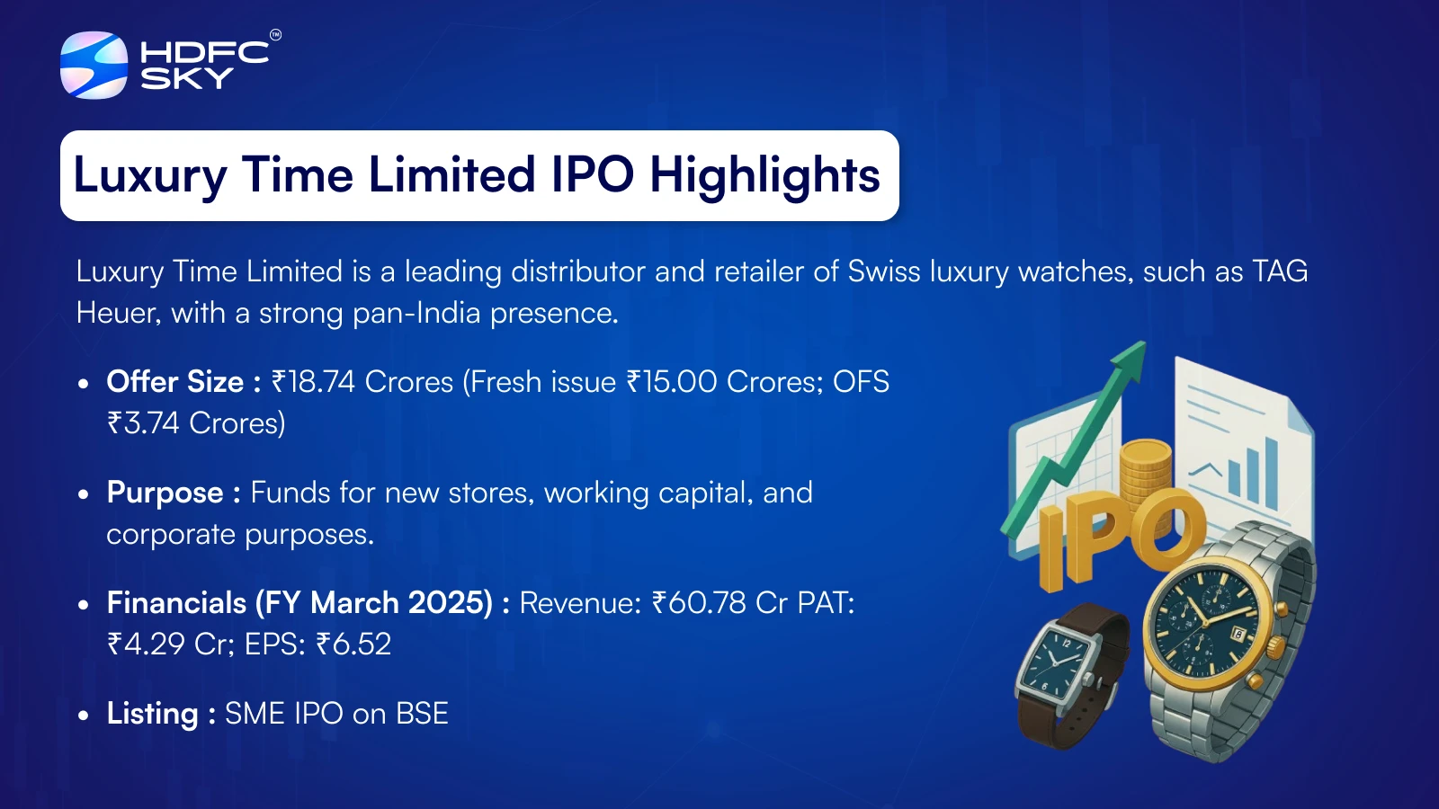 The Luxury Time Limited IPO is a book-built issue of ₹18.74 crores, combining a fresh issue of shares worth ₹15.00 crores and an offer for sale (OFS) of ₹3.74 crores. The subscription window is open from December 4 to December 8, 2025. With a price band of ₹78 to ₹82 per share, the lot size is 1,600 shares, making the minimum investment ₹2,62,400 for retail investors. The tentative timeline includes allotment finalization by December 9, 2025, and listing on BSE SME on December 11, 2025. GYR Capital Advisors Pvt. Ltd. is the book running lead manager, and MAS Services Ltd. is the registrar.
