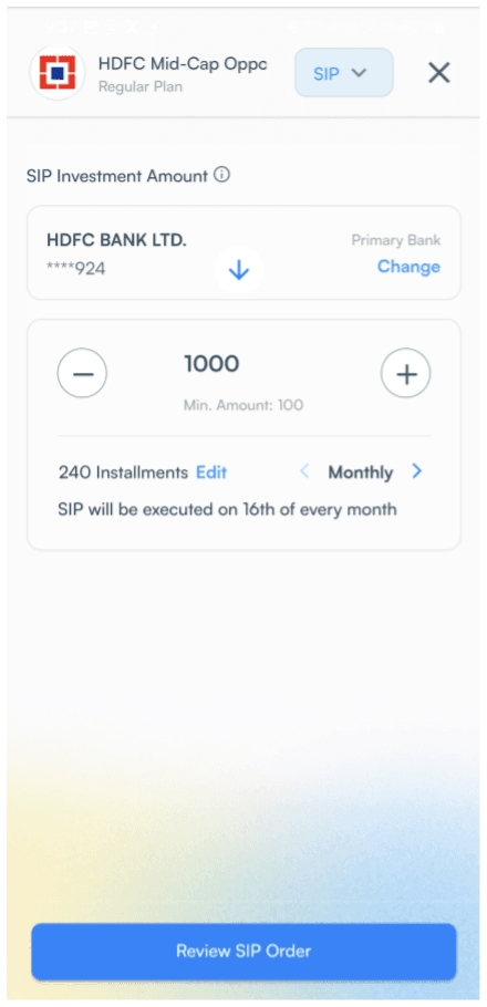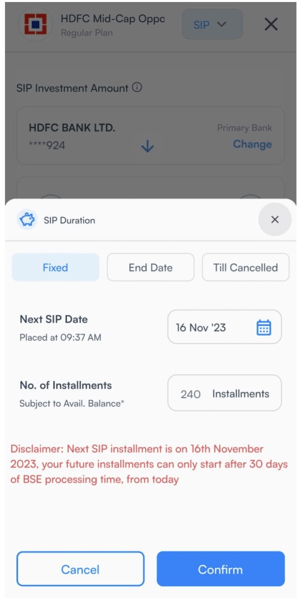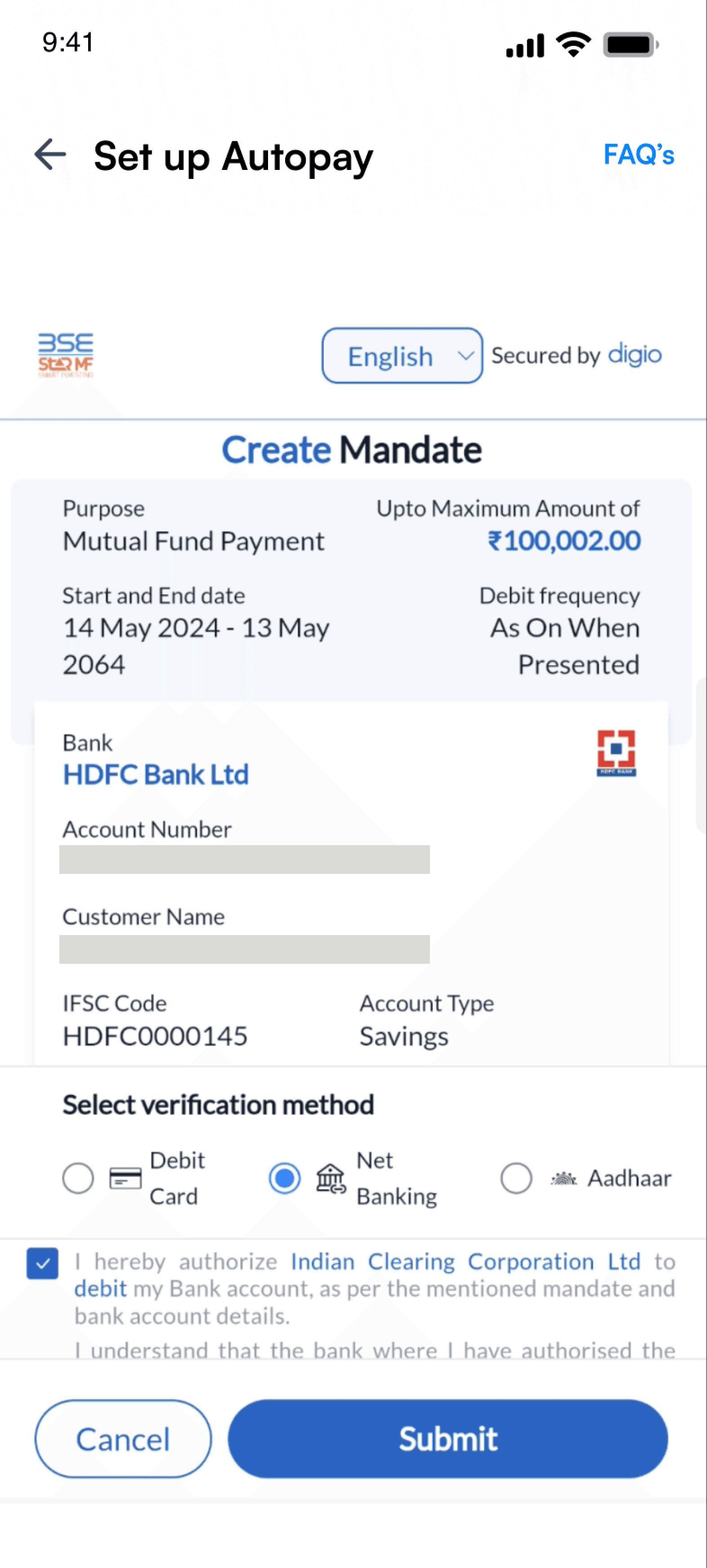 Note: HDFC SKY will allow you to setup AutoPay mandate within 6 working days from your first SIP order placed. If you failed to setup AutoPay in T+6 days, your first SIP will get cancelled.