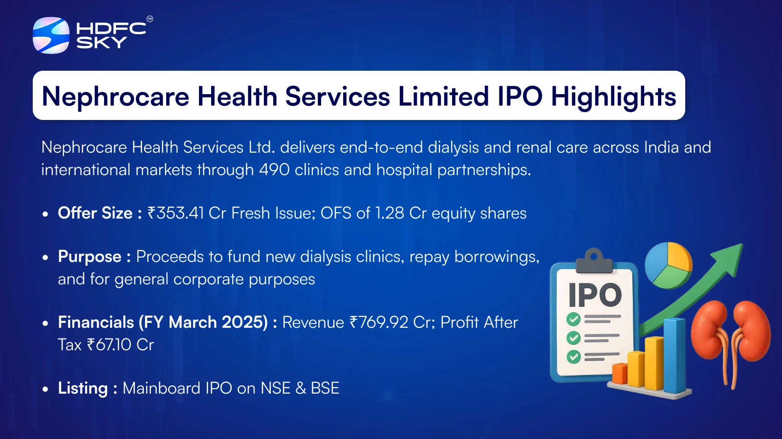 Nephrocare Health IPO is a book-built issue that includes a fresh issue worth ₹353.41 crores along with an offer for sale of 1.13 crore shares. The IPO opens for subscription on December 10, 2025, and closes on December 12, 2025. The allotment is expected to be finalised on December 15, 2025, and the company is scheduled to list on both BSE and NSE on December 17, 2025. The price band for the issue is yet to be announced. ICICI Securities Ltd. is acting as the book-running lead manager, while Kfin Technologies Ltd. is serving as the registrar for the IPO.