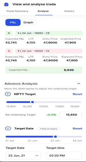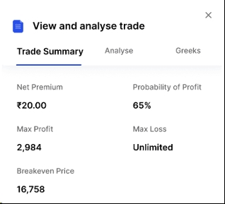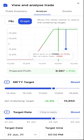 Once you click on the Analyze feature, you will get insights of Trade Summary, Analyse Pay-off graph and Greeks