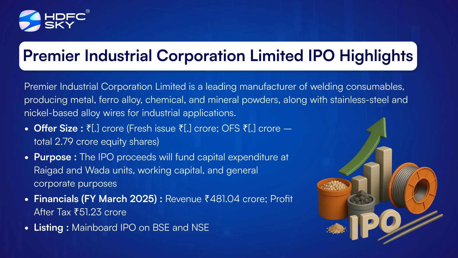Premier Industrial Corporation Limited filed its Draft Red Herring Prospectus (DRHP) with SEBI on September 29, 2025, to raise funds through an Initial Public Offer (IPO). The IPO is a Book Built Issue of 2.79 crore equity shares, comprising a fresh issue of up to 2.25 crore shares and an offer for sale of up to 0.54 crore shares. The equity shares are proposed to be listed on NSE and BSE. Unistone Capital Pvt. Ltd. is the book-running lead manager, while MUFG Intime India Pvt. Ltd. serves as the registrar. Details such as IPO dates, price bands, and lot size are yet to be announced. The promoters of the company include Arvind Chhotalal Morzaria, Dilip Chhotalal Morzaria, Subhash Chhotalal Morzaria, Lalit Navinchandra Morzaria, Smeet Morzaria, Meet Arvind Morzaria, and Anand Dilip Morzaria, holding 100% of the shares before the issue.