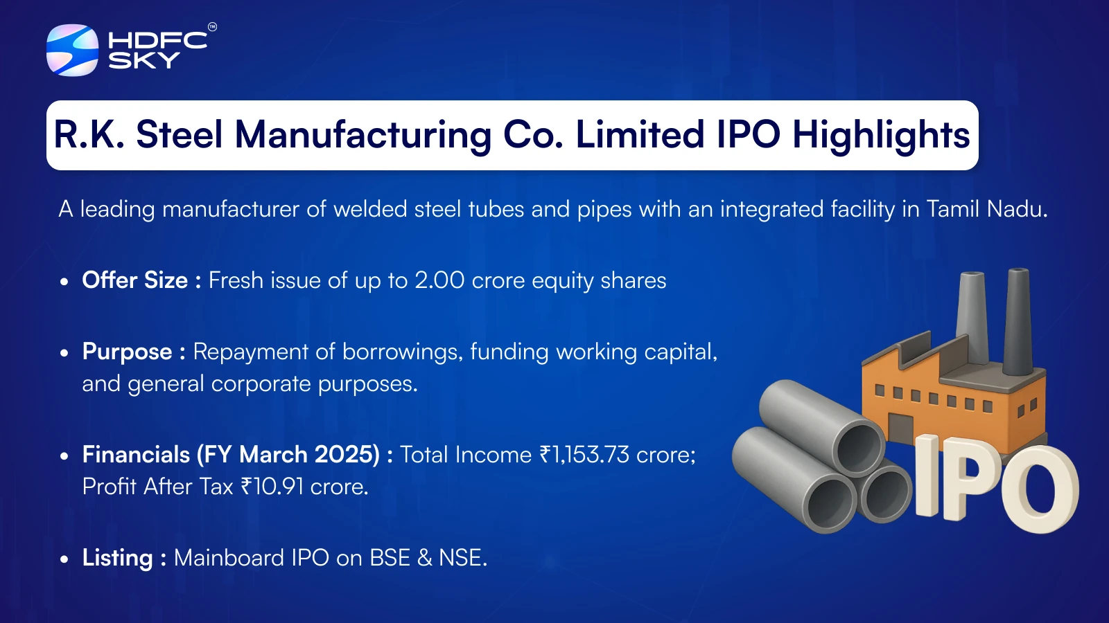 Incorporated in 2006, R.K. Steel Manufacturing Co. Limited is a prominent manufacturer of welded structural steel tubes and pipes. The company boasts a diverse product portfolio, including Pre-Galvanised Pipes (GP), Hot Dip Galvanised Pipes (GI), Hot Rolled Pipes (HR), and Cold Rolled Pipes (CR), alongside value-added products like GP Coils and CRFH Coils. Its products cater to a wide array of industries such as construction, automotive, solar power, and engineering. Operating from a strategically located, integrated 18.49-acre facility in Perundurai, Tamil Nadu, the company is equipped with advanced machinery, including nine tube mills and a tandem cold rolling mill, serving a loyal base of over 470 customers.