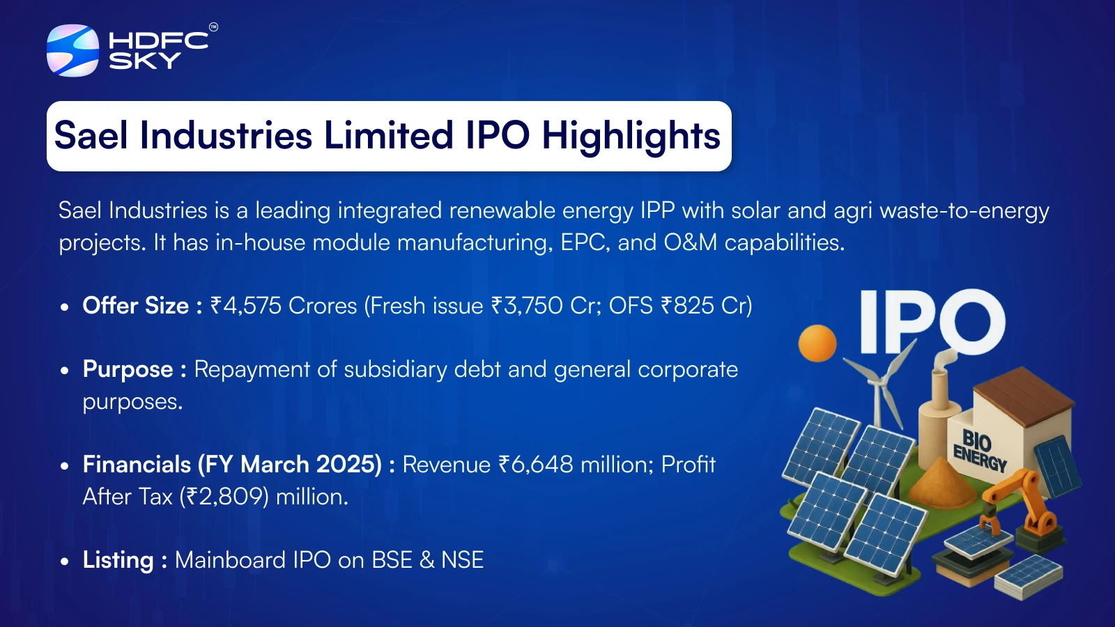 Sael Industries Limited is one of India’s top five renewable energy independent power producers (IPPs), distinguished by its fully integrated model that combines project development, in-house solar module manufacturing, EPC, and O&M services. Incorporated in 2022, the company has rapidly built a significant footprint in the Indian renewable sector.