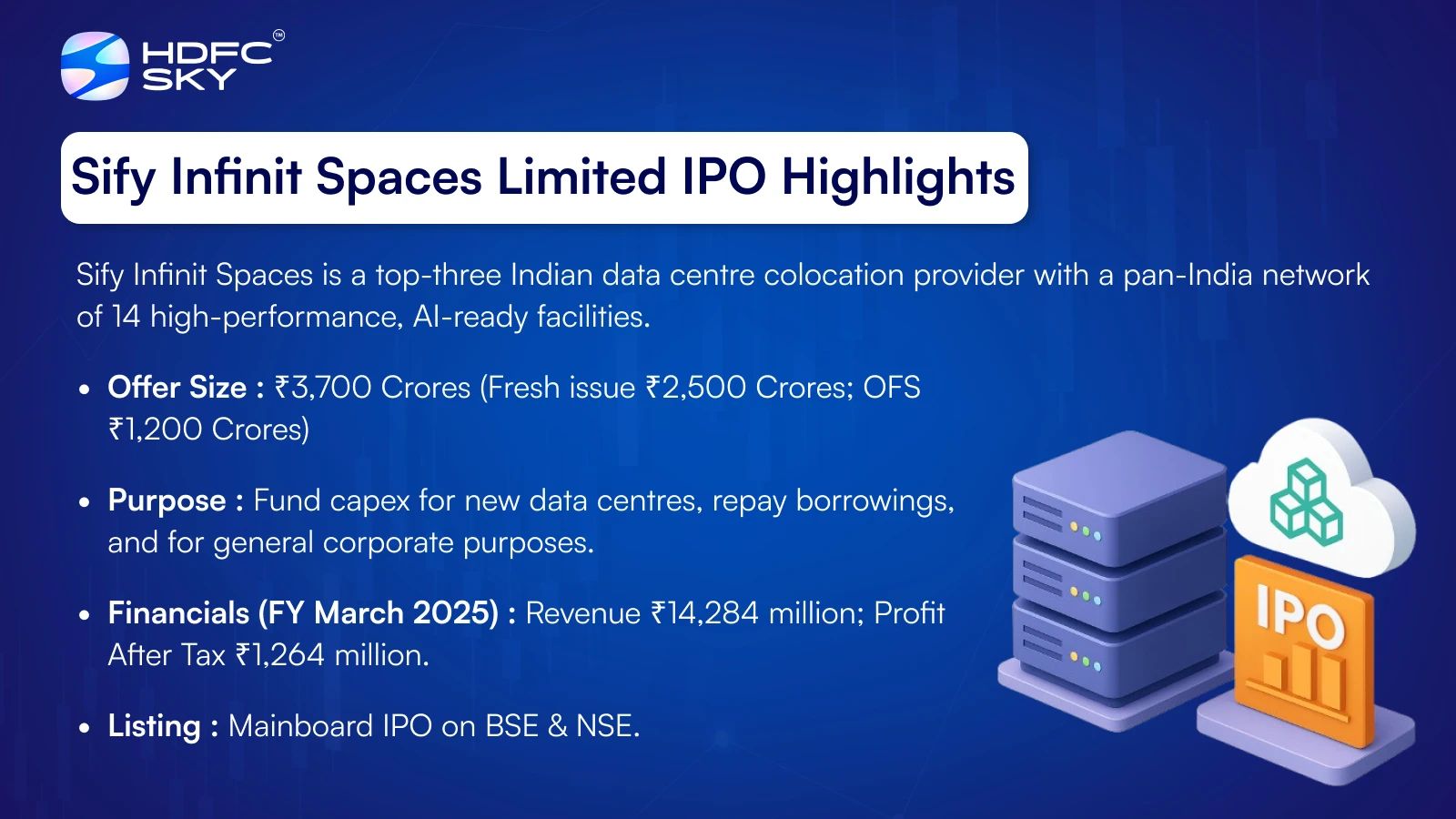 Sify Infinit Spaces Ltd. has filed a Draft Red Herring Prospectus (DRHP) with SEBI on October 16, 2025, to raise funds through an Initial Public Offering (IPO). The IPO is a book-building issue of ₹3,700.00 crores, comprising a fresh issue of shares worth ₹2,500.00 crores and an offer for sale (OFS) of ₹1,200.00 crores. The equity shares are proposed to be listed on both the NSE and BSE. JM Financial Ltd. is acting as the book running lead manager, while Kfin Technologies Ltd. is the registrar of the issue. Key details such as IPO dates, price bands, and lot size are yet to be announced.