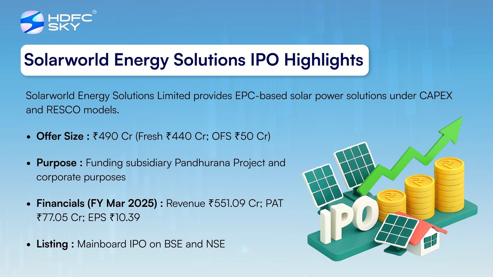 Solarworld Energy Solutions IPO is a book-built issue worth ₹490 crore, comprising a fresh issue of 1.25 crore shares totaling ₹440 crore and an offer for sale of 0.14 crore shares worth ₹50 crore. The IPO opens for subscription on 23 September 2025 and closes on 25 September 2025, with allotment expected on 26 September 2025. Shares are tentatively scheduled to list on BSE and NSE on 30 September 2025. The price band is ₹333 to ₹351 per share, with a lot size of 42 shares. Retail investors require a minimum investment of ₹14,742, sNII 14 lots (₹2,06,388), and bNII 68 lots (₹10,02,456). Nuvama Wealth Management Ltd. is the lead manager and MUFG Intime India Pvt. Ltd. is the registrar.