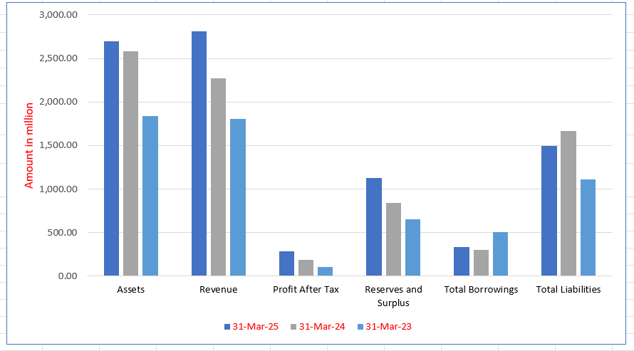 Technocraft Ventures has shown consistent growth in revenue and profitability over the last three financial years. Revenue from operations grew from ₹1,786.91 million in FY 2023 to ₹2,795.64 million in FY 2025, a CAGR of approximately 16.09%. Profit After Tax (PAT) also increased significantly, reflecting the company’s ability to scale operations efficiently while improving its bottom line.